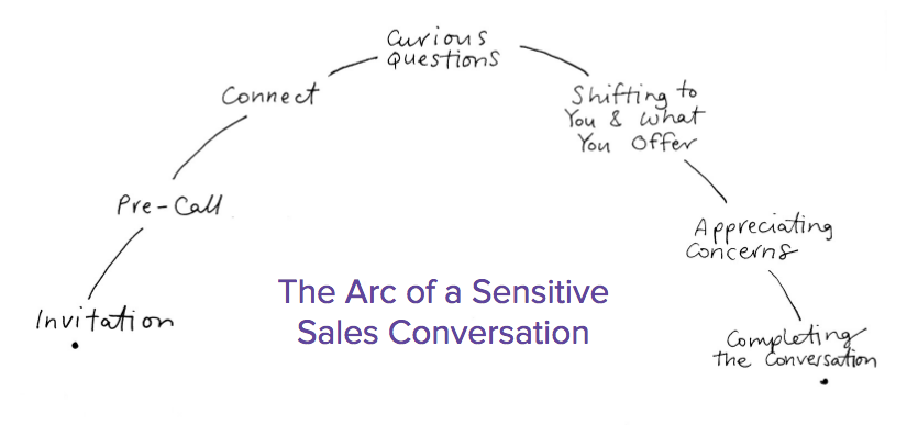 I outlined the entire arc of a Sensitive Sales conversation from connecting with your potential client to asking curious questions to sharing what you offer to appreciating their concerns to celebrating and completing the conversation.